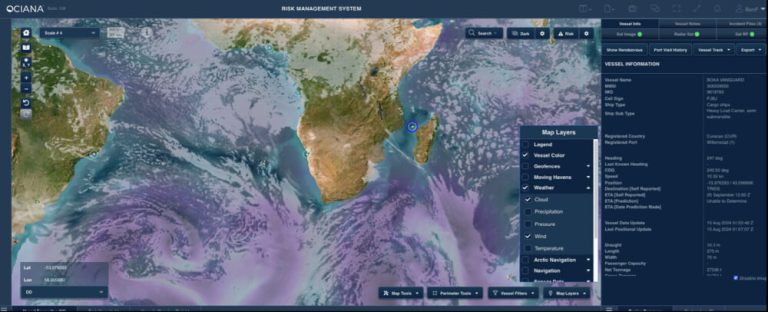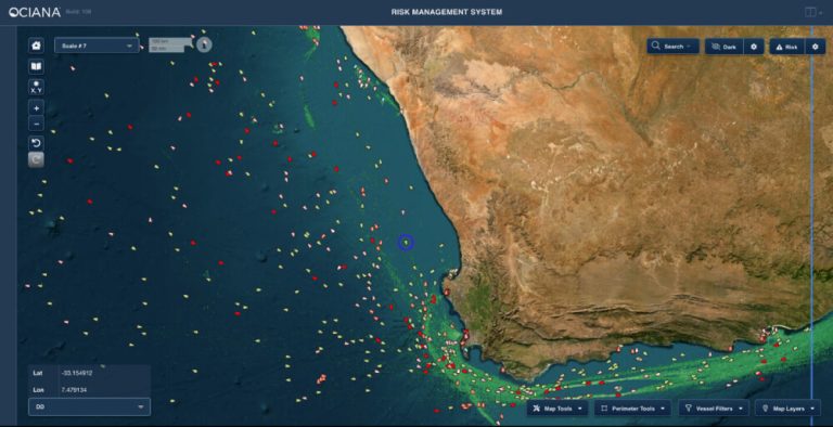 As the MV Ultra Galaxy drifted toward the South African coast, the situation became increasingly dire. The risk of environmental contamination from the grounded vessel was significant, prompting a rapid response from Smit Salvage, a leading company in maritime salvage operations. Using OCIANA®, the progress of the salvage efforts can be meticulously monitored and analysed in real-time, ensuring efficient and effective management. Given that Smit Salvage is a subsidiary of Boskalis, there may be a need for additional vessels to assist in the operation. OCIANA’s AI powered tracking capabilities allow for the monitoring and analyzing of nearby Boskalis-owned ships, ensuring that support can be mobilized quickly. Additionally, the unpredictable weather off the South African coast poses a considerable challenge to the operation. OCIANA’s advanced weather monitoring tools provide crucial real-time updates, enabling the salvage team to assess the safety of their efforts and plan accordingly.